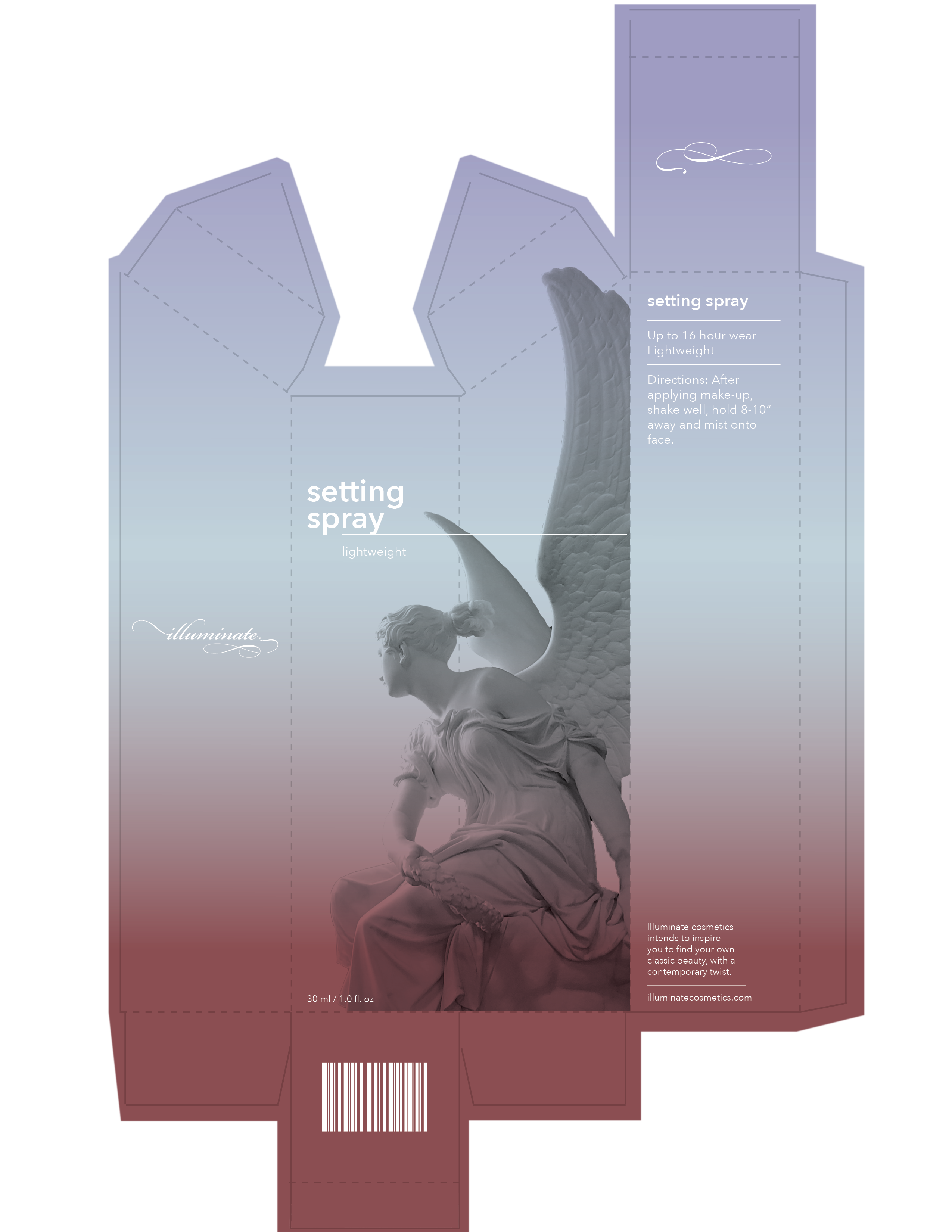 Packaging created for a fictional makeup brand, Illuminate Cosmetics. Using my orignal photography, Illuminate Cosmetics strives to mesh classical beauty with a contemporary feel.